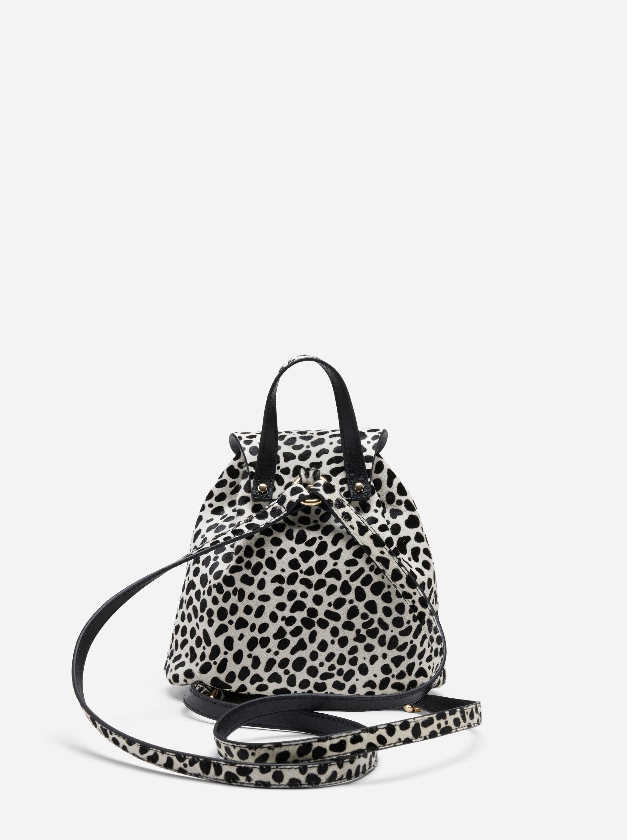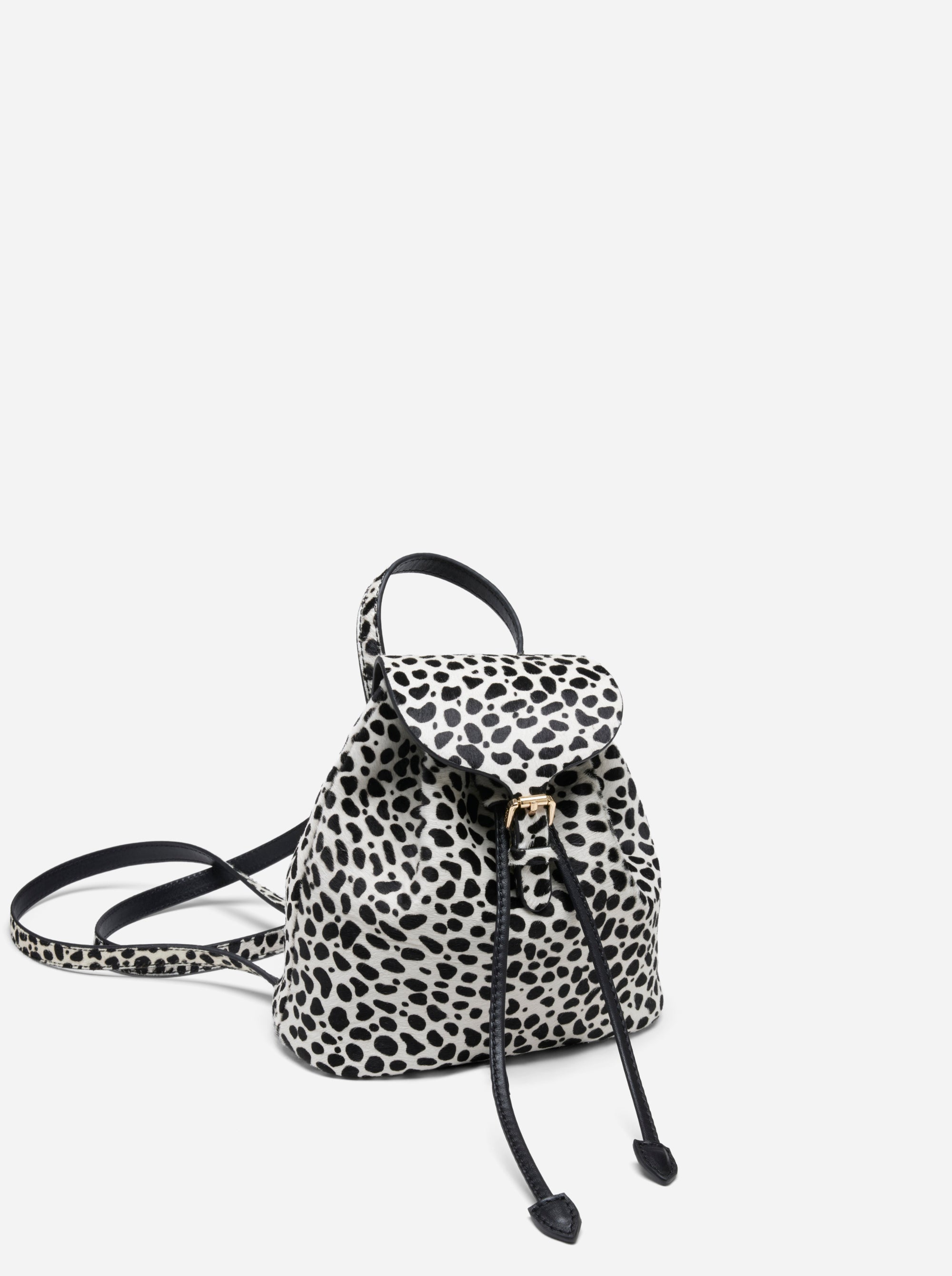Playful yet refined, the Mini Backpack in Dalmatian-patterned calf hair reinterprets Manu Atelier’s signature craftsmanship with a bold and tactile twist. The softly structured design features a drawstring closure that creates effortless movement and charm. Designed for versatility, its slender straps allow it to be carried both as a backpack and over the shoulder. With its elegant aesthetic and practical versatility, it is the perfect companion for everyday life. Its texture and chic silhouette also make it an elegant choice for evening wear.