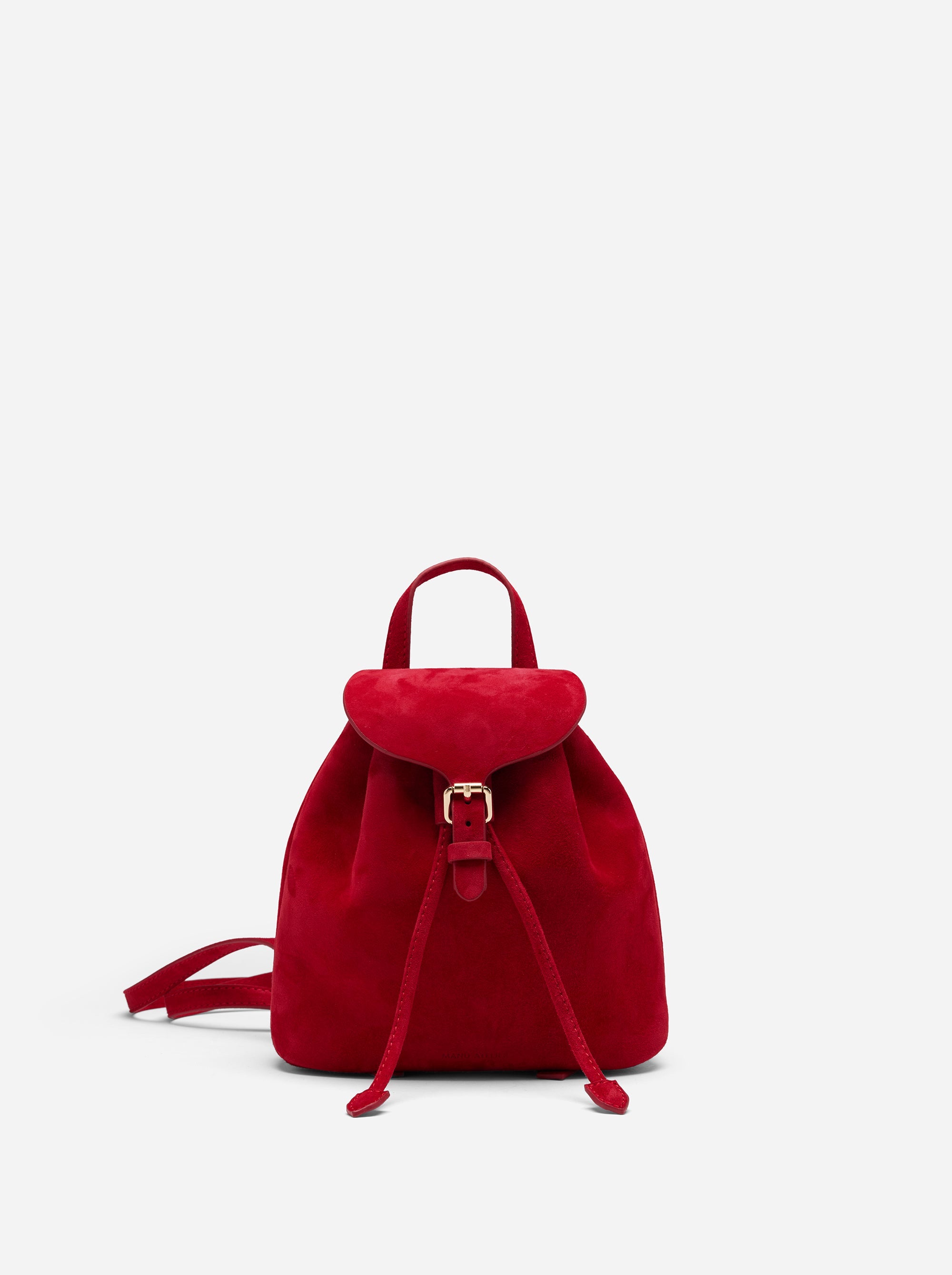Drawstring top with a self-leather slider; finished with a buckle-fastened flap and a magnetic closure